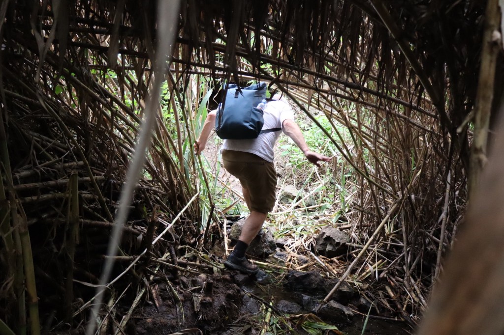 Bamboo tunnel. Love Clive’s expression here. The penny drops. We are off track. We have to turn back, or be lost in the jungle until a dog walker finds our corpses.